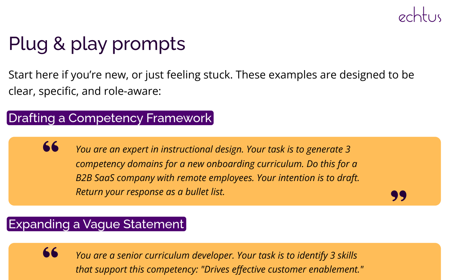 This is your guide to writing better GenAI prompts that support outcome-based, competency-driven learning. Whether you're an L&D leader, instructional designer, or customer education professional, this worksheet can help you: